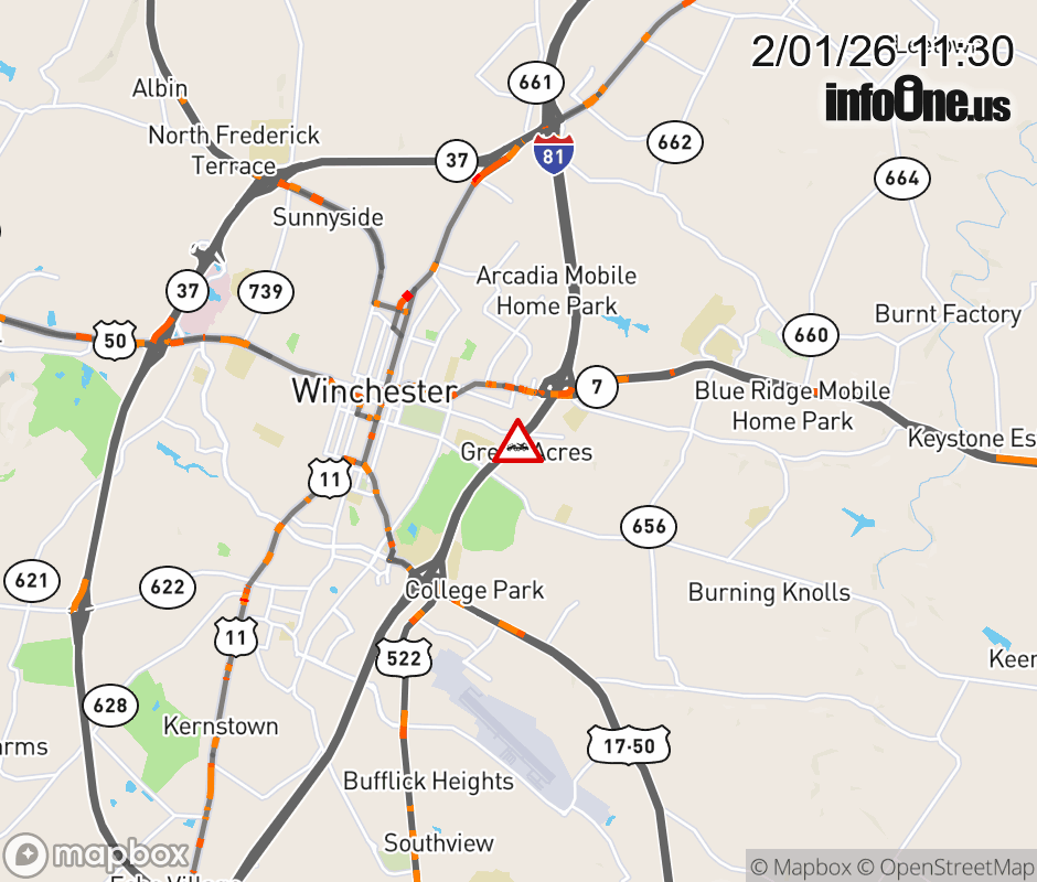 On I-81 at mile marker 315 in the County of Frederick, motorists can expect delays due to a disabled vehicle. The north exit ramp narrows. Updated: Sun 2/1/26 11:30 AM EST ![]() Updated: Sun 2/1/26 11:30 AM EST |