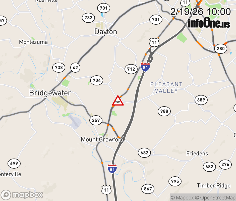 On Rt. 704 in the County of Rockingham, in the vicinity of S Valley Pike; US-11N, motorists can expect delays due to a vehicle crash. All north lanes are closed. All south lanes are closed. Updated: Thu 2/19/26 10:00 AM EST ![]() Updated: Thu 2/19/26 10:00 AM EST |