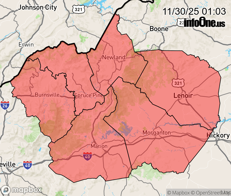 Canceled 11/30/25 8:52 AM Winter Weather Advisory issued November 30 at 1:01AM EST until November 30 at 9:00AM EST by NWS Greenville-Spartanburg SC * WHAT... Freezing rain. Additional ice accumulations around a light glaze. * WHERE... Burke Mountains, Caldwell Mountains, McDowell Mountains, Avery, Mitchell, and Yancey Counties. * WHEN... Until 9 AM EST this morning. * IMPACTS... Icing may create slippery conditions on roads, bridges and sidewalks. ![]() |