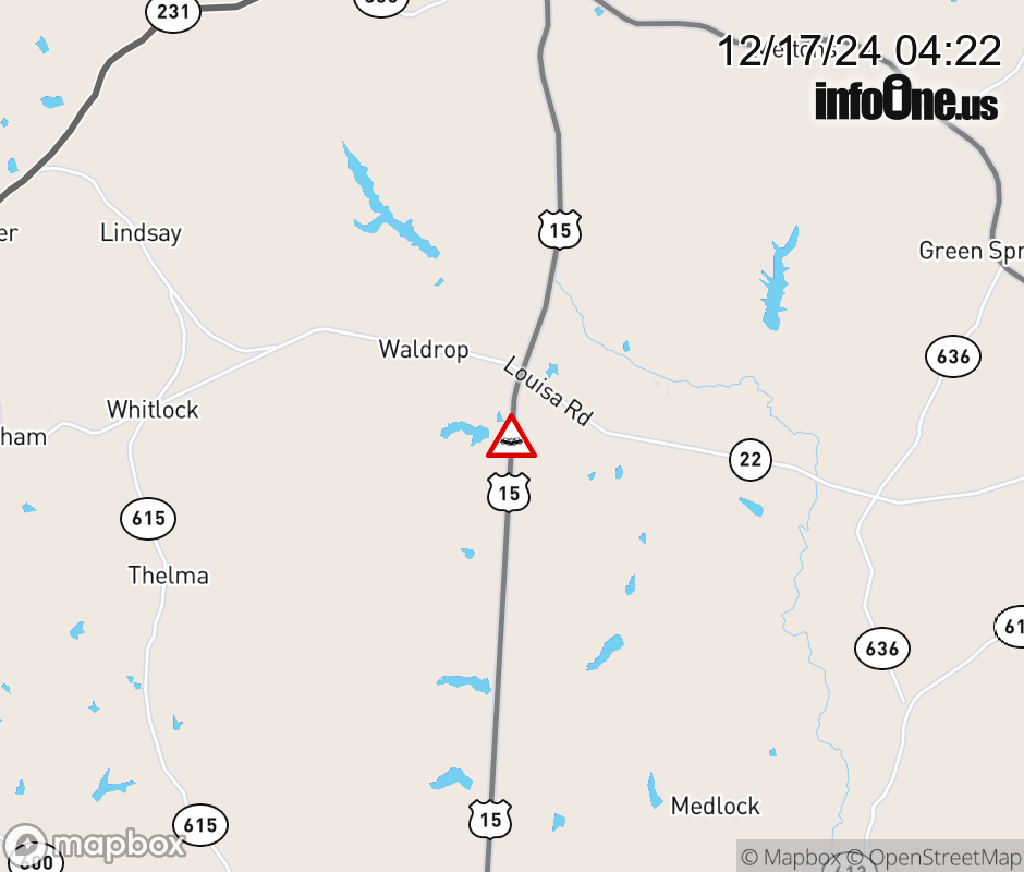 On US-15 in the County of Louisa, in the vicinity of Louisa Rd; VA-22E, motorists can expect delays due to a vehicle crash. All north lanes are closed. All south lanes are closed. ![]() |