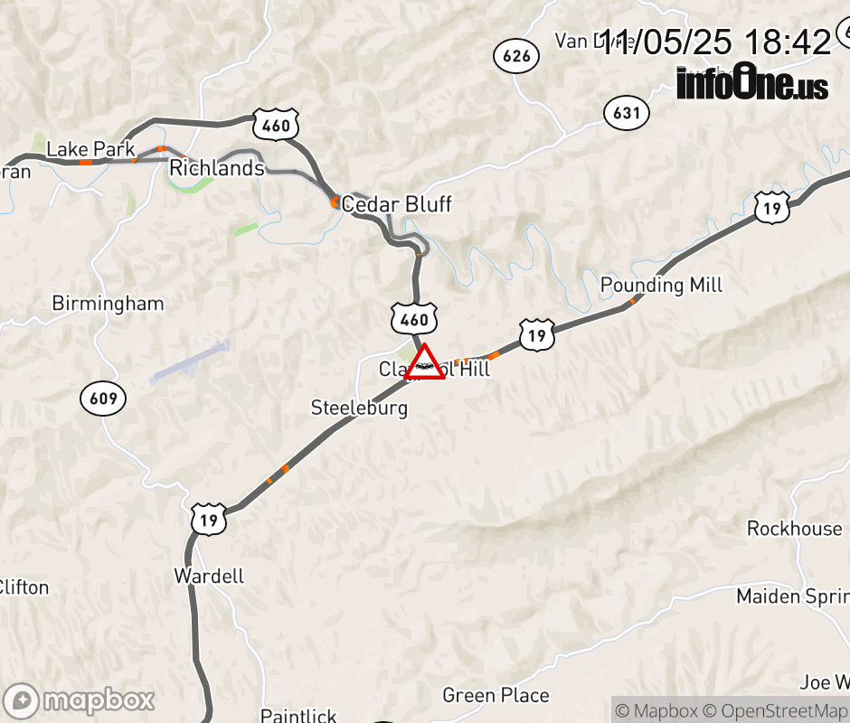 On US-460 East in the County of Tazewell, in the vicinity of Steelsburg Hwy; US-19S, motorists can expect delays due to a vehicle crash. Lane closures exist. ![]() |