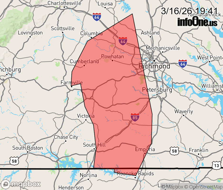 Canceled 3/16/26 8:00 PM Severe Thunderstorm Warning issued March 16 at 7:40PM EDT until March 16 at 8:30PM EDT by NWS Wakefield VA SVRAKQ The National Weather Service in Wakefield has issued a * Severe Thunderstorm Warning for... Northwestern Northampton County in northeastern North Carolina... Southeastern Louisa County in central Virginia... Greensville County in southeastern Virginia... Cumberland County in central Virginia... Nottoway County in south central Virginia... Goochland County in central Virginia... Northwestern Hanover County in central Virginia... Southwestern Sussex County in southeastern Virginia... Dinwiddie County in south central Virginia... Powhatan County in central Virginia... Chesterfield County in central Virginia... Southeastern Mecklenburg County in south central Virginia... East central Prince Edward County in central Virginia... Eastern Lunenburg County in south central Virginia... The City of Emporia in southeastern Virginia... Northwestern Henrico County in central Virginia... Amelia County in central Virginia... Brunswick County in south central Virginia... * Until 830 PM EDT. * At 739 PM EDT, severe thunderstorms were located along a line extending from near Gold Hill to near Kenbridge to near La Crosse to near Norlina, moving northeast at 50 mph. HAZARD...60 mph wind gusts. SOURCE...Radar indicated. IMPACT...Expect damage to trees and powerlines. * Severe thunderstorms will be near... Cumberland, South Hill, Blackstone, Crewe, Kenbridge, Brodnax, Nottoway, La Crosse, Dundas, and Sunnyside around 745 PM EDT. Cartersville, Morven, Duncan, Ballsville, Fort Barfoot, Tobaccoville, and Trenholm around 750 PM EDT. Lawrenceville, Amelia Courthouse, Brunswick, Alberta, Spainville, Gasburg, Macon, and Fife around 755 PM EDT. Powhatan, Mannboro, Scotts Fork, Wilsons, and Chula around 800 PM EDT. Goochland, McKenney, and Gum Spring around 805 PM EDT. Moseley, Oilville, and Dewitt around 810 PM EDT. Dinwiddie, Purdy, Radium, Manakin, and Sabot around 815 PM EDT. Tuckahoe, Bon Air, Montpelier, Wyndham, and Sutherland around 820 PM EDT. Other locations impacted by these severe thunderstorms include Bacons Fork, Angola, Gum Forks, Dolphin, Murdocks, Maidens, Henrico, Forksville, Pocahontas State Park, and Skinquarter. ![]() |