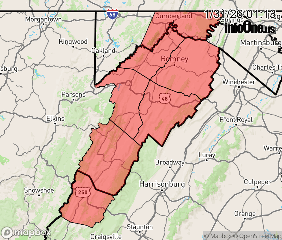 Canceled 1/31/26 9:48 AM Cold Weather Advisory issued January 31 at 1:12AM EST until January 31 at 11:00AM EST by NWS Baltimore MD/Washington DC * WHAT... For the Cold Weather Advisory, very cold wind chills as low as 12 below. For the Extreme Cold Warning, dangerously cold wind chills as low as 20 below expected. * WHERE... In Maryland, Central and Eastern Allegany County. In Virginia, Eastern Highland County. In West Virginia, Eastern Grant, Eastern Mineral, Eastern Pendleton, Hampshire, and Hardy Counties. * WHEN... For the Cold Weather Advisory, until 11 AM EST this morning. For the Extreme Cold Warning, from 7 PM this evening to 1 PM EST Sunday. * IMPACTS... The cold wind chills as low as 20 below zero could result in hypothermia or frostbite if precautions are not taken. Frostbite and hypothermia will occur if unprotected skin is exposed to these temperatures. Wind chill values can lead to hypothermia with prolonged exposure. ![]() |