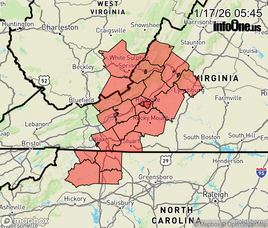 Canceled 1/17/26 10:00 AM Special Weather Statement issued January 17 at 5:44AM EST by NWS Blacksburg VA Snow showers will bring some light accumulations less than an inch to most areas this morning. Be prepared for slick spots on untreated roads, particularly on bridges and overpasses. Please allow extra time to reach your destination. ![]() |