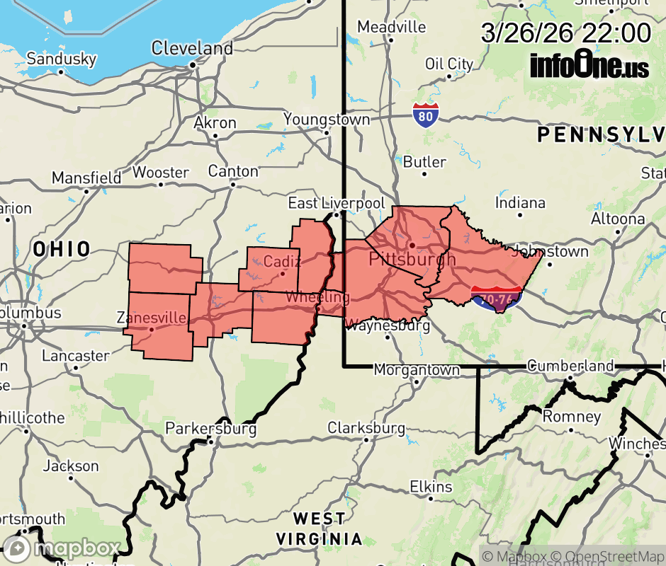 Canceled 3/26/26 10:11 PM Tornado Watch issued March 26 at 9:59PM EDT until March 26 at 11:00PM EDT by NWS Pittsburgh PA TORNADO WATCH 75 REMAINS VALID UNTIL 11 PM EDT THIS EVENING FOR THE FOLLOWING AREAS IN OHIO THIS WATCH INCLUDES 6 COUNTIES IN EAST CENTRAL OHIO BELMONT COSHOCTON GUERNSEY HARRISON JEFFERSON OH MUSKINGUM IN PENNSYLVANIA THIS WATCH INCLUDES 3 COUNTIES IN SOUTHWEST PENNSYLVANIA ALLEGHENY WASHINGTON WESTMORELAND IN WEST VIRGINIA THIS WATCH INCLUDES 2 COUNTIES IN THE NORTHERN PANHANDLE OF WEST VIRGINIA BROOKE OHIO THIS INCLUDES THE CITIES OF CADIZ, CAMBRIDGE, CANONSBURG, COSHOCTON, FOLLANSBEE, GREENSBURG, LATROBE, MARTINS FERRY, MURRYSVILLE, NEW KENSINGTON, PITTSBURGH METRO AREA, ST. CLAIRSVILLE, STEUBENVILLE, WASHINGTON, WELLSBURG, WHEELING, AND ZANESVILLE. ![]() |