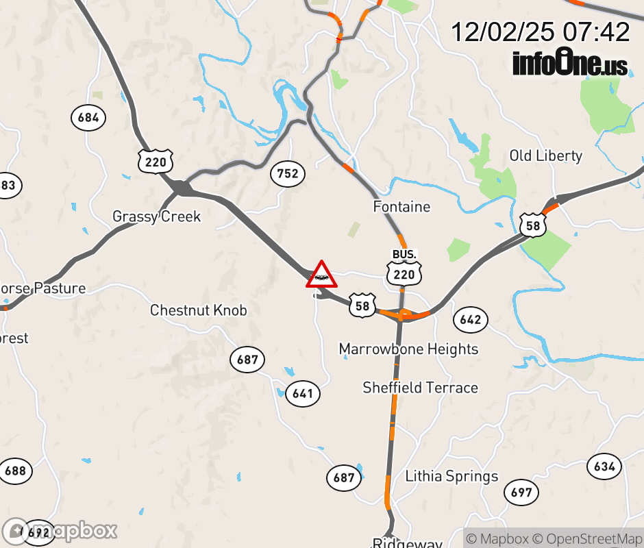 On Rt. 641 North in the County of Henry, in the vicinity of Joseph Martin Hwy; William F Stone Hwy; Rt. 685N/S (Henry County), motorists can expect delays due to a vehicle crash. Lane closures exist. ![]() |