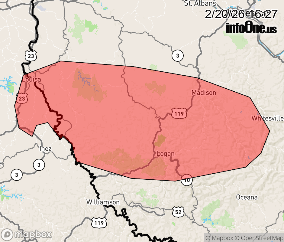 Canceled 2/20/26 4:30 PM Flood Warning issued February 20 at 4:25PM EST until February 20 at 4:30PM EST by NWS Charleston WV The Flood Warning will expire at 430 PM EST this afternoon for portions of northeast Kentucky, including the following county, Lawrence and West Virginia, including the following counties, Boone, Lincoln, Logan, Mingo, Raleigh and Wayne. Flood waters are receding, so the Flood Warning is being allowed to expire. However, motorists should continue to exercise extreme caution and be prepared for water or debris remaining on roadways. Please continue to heed remaining road closures. ![]() |