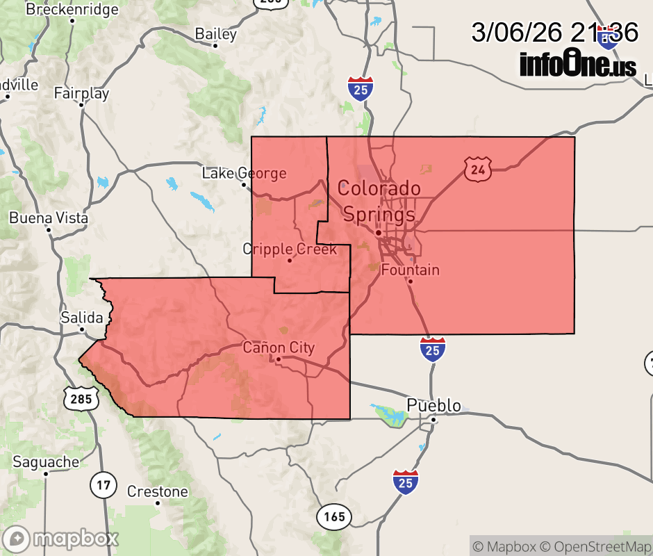 Canceled 3/7/26 12:00 AM Winter Weather Advisory issued March 6 at 7:35PM MST until March 7 at 12:00AM MST by NWS Pueblo CO * WHAT... Snow. Additional snow accumulations up to 2 inches. Winds gusting as high as 45 mph. * WHERE... Northern El Paso, Northwestern Fremont County Above 8500 Feet, and Pikes Peak,Teller County and the Rampart Range Between 7500 and 11000 Feet. * WHEN... Until midnight MST tonight. * IMPACTS... Plan on slick and snow covered roads. Conditions will remain hazardous through the evening. ![]() |