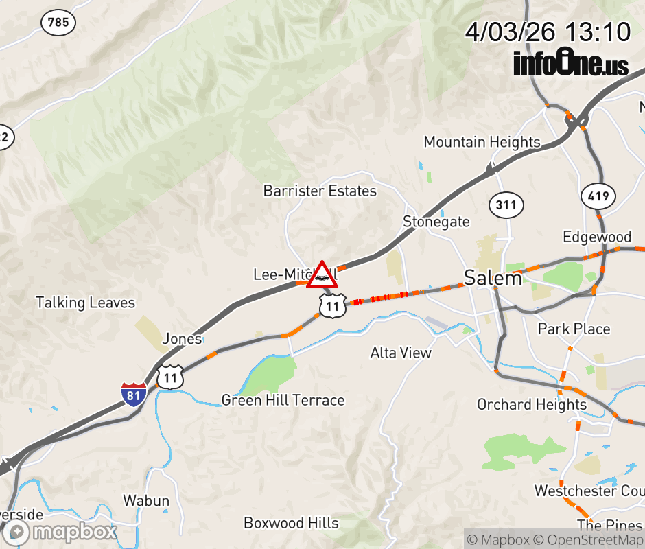On I-81 at mile marker 137.3 in the County of Roanoke, motorists can expect delays due to a vehicle crash. The north right shoulder is closed. ![]() |