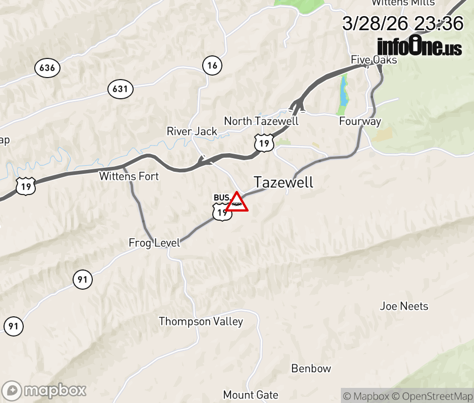 On BUS US-19 in the County of Tazewell, in the vicinity of County/City/Town Line: TAZEWELL, motorists can expect delays due to a vehicle crash. The east right lane and right shoulder are closed. Updated: Sat 3/28/26 11:36 PM EDT ![]() Updated: Sat 3/28/26 11:36 PM EDT |