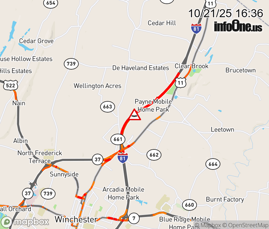On I-81 at mile marker 319 in the County of Frederick, motorists can expect delays due to a vehicle crash. The north left shoulder is closed. Updated: Tue 10/21/25 4:36 PM EDT ![]() Updated: Tue 10/21/25 4:36 PM EDT |