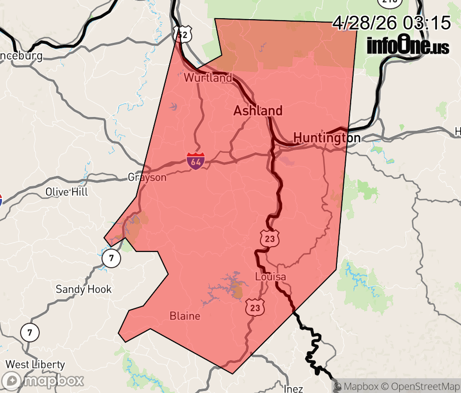 Canceled 4/28/26 3:30 AM Special Weather Statement issued April 28 at 3:14AM EDT by NWS Charleston WV At 313 AM EDT, Doppler radar was tracking strong thunderstorms along a line extending from near Ironton to near Webbville to Mima. Movement was east at 60 mph. HAZARD...Wind gusts of 50 to 55 mph and pea size hail. SOURCE...Radar indicated. IMPACT...Gusty winds could knock down tree limbs and blow around unsecured objects. Minor hail damage to vegetation is possible. Locations impacted include... Huntington, Ashland, Ironton, Grayson, Louisa, Coal Grove, Wayne, Chesapeake, Proctorville, Blaine, Beech Fork State Park, Cannonsburg, Lake Vesuvius, Grayson Lake State Park, Yatesville Lake State Park, Kenova, Catlettsburg, Ceredo, Greenup, and Fort Gay. This includes the following highways... Interstate 64 in Kentucky between mile markers 171 and 191. Interstate 64 in West Virginia between mile markers 1 and 11. ![]() |