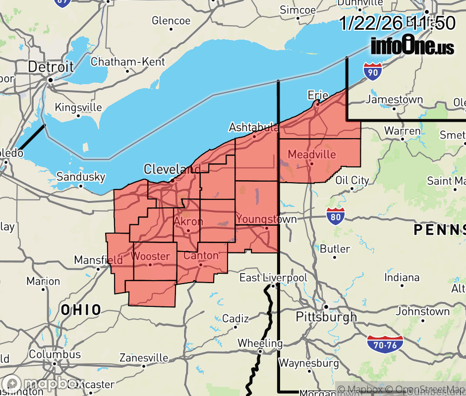 Canceled 1/22/26 3:03 PM Winter Storm Watch issued January 22 at 11:49AM EST until January 26 at 1:00PM EST by NWS Cleveland OH * WHAT... Heavy snow possible. Total snow accumulations in excess of 6 inches. * WHERE... Portions of north central and northeast Ohio and northwest Pennsylvania. * WHEN... From Saturday evening through Monday afternoon. * IMPACTS... Travel could be difficult. The hazardous conditions could impact the Thursday morning and evening commutes, and the Monday morning commute. * ADDITIONAL DETAILS... The heaviest snow is expected on Sunday. Sub-zero wind chills are expected Saturday night into Sunday morning, and again Sunday night into Monday morning. ![]() |