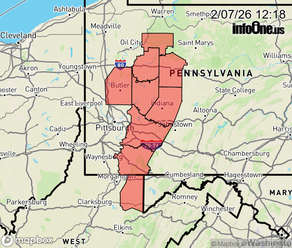 Canceled 2/7/26 9:32 PM Extreme Cold Warning issued February 7 at 12:17PM EST until February 8 at 10:00AM EST by NWS Pittsburgh PA * WHAT... Dangerously cold wind chills as low as 20 below zero. * WHERE... In Pennsylvania, Forest, Jefferson PA, Higher Elevations of Fayette, Higher Elevations of Westmoreland, Armstrong, Butler, Clarion, Higher Elevations of Indiana, and Indiana Counties. In West Virginia, Eastern Preston County. * WHEN... Until 10 AM EST Sunday. * IMPACTS... The dangerously cold wind chills as low as 20 below zero could result in hypothermia or frostbite if precautions are not taken. ![]() |
