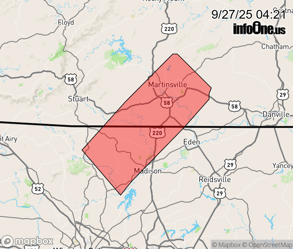 Canceled 9/27/25 4:30 AM Flood Advisory issued September 27 at 4:20AM EDT until September 27 at 4:30AM EDT by NWS Blacksburg VA The Flood Advisory will expire at 430 AM EDT early this morning for portions of north central North Carolina, including the following counties, Rockingham and Stokes and Virginia, including the following counties and independent city, City of Martinsville, Henry and Patrick. Flood waters have receded. The heavy rain has ended. Flooding is no longer expected to pose a threat. Please continue to heed remaining road closures. ![]() |