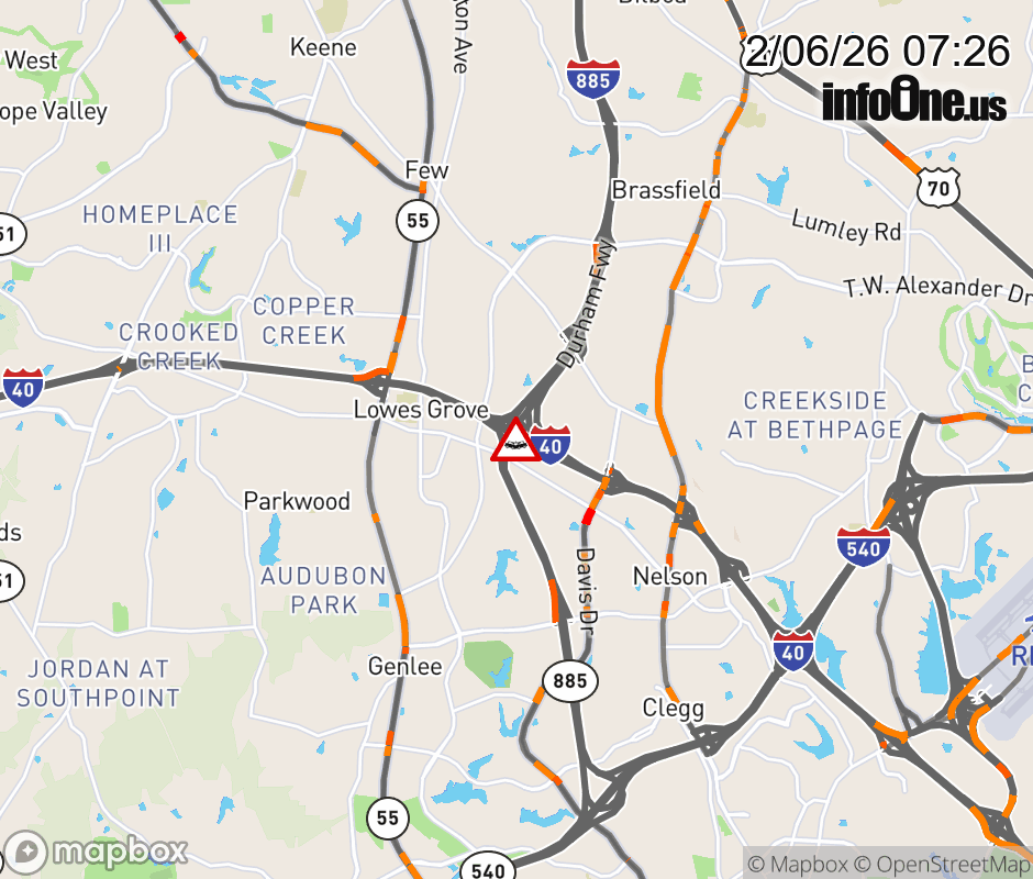 The ramp lane is narrowed on Exit 279 B (I-885 / Durham Fwy). Updated: Fri 2/6/26 7:26 AM EST ![]() Updated: Fri 2/6/26 7:26 AM EST |