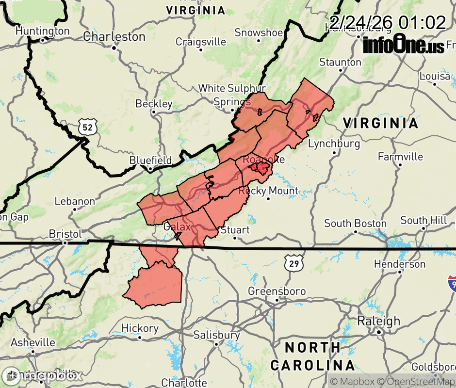 Canceled 2/24/26 5:00 AM Special Weather Statement issued February 24 at 1:00AM EST by NWS Blacksburg VA Lake enhanced snow showers will gradually taper down to flurries this morning. While little to no additional accumulations are expected, slick roadways remain possible this morning due to overnight temperatures causing potential for refreezing. Assume any untreated roads and surfaces, including bridges, overpasses, decks, and steps could be icy. If traveling, slow down and exercise caution. Allow plenty of extra time to reach your destination. ![]() |