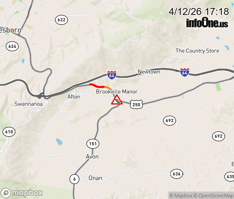 On US-250 in the County of Albemarle, in the vicinity of Old Turnpike Rd; Rt. 750E/W (Albemarle County), motorists can expect delays due to a vehicle fire. All west lanes are closed. Updated: Sun 4/12/26 5:18 PM EDT ![]() Updated: Sun 4/12/26 5:18 PM EDT |