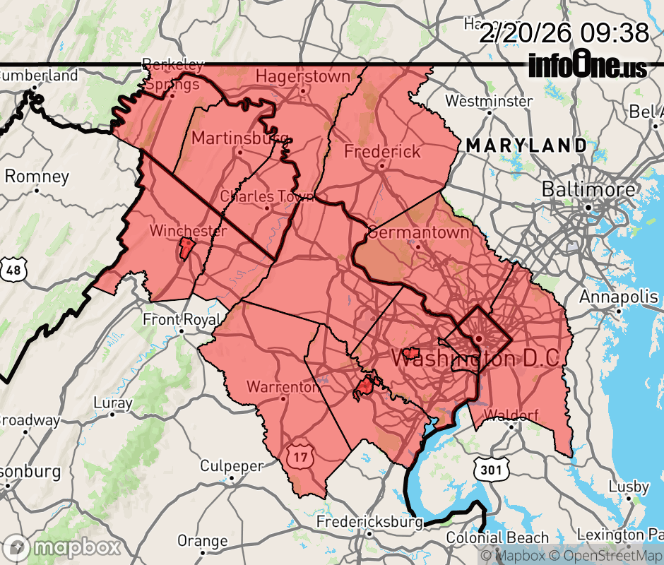 Canceled 2/20/26 12:45 PM Special Weather Statement issued February 20 at 9:37AM EST by NWS Baltimore MD/Washington DC Light to moderate rain over the past 24 to 36 hours has led to much of the region observing between 0.75 and an inch of precipitation with locally higher amounts near 1.25 inches. Rain is exiting the region at this time, but the combination of rain along with increased runoff may lead to puddling of water at low spots on roads and the potential for nuisance stream flooding that may lead to travel impacts. Avoid driving through flooded roads and prevent children from playing in retaining ponds and large puddles. ![]() |