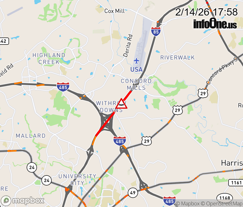 The right shoulder is closed near Exit 48 (I-485). Updated: Sat 2/14/26 5:58 PM EST ![]() Updated: Sat 2/14/26 5:58 PM EST |