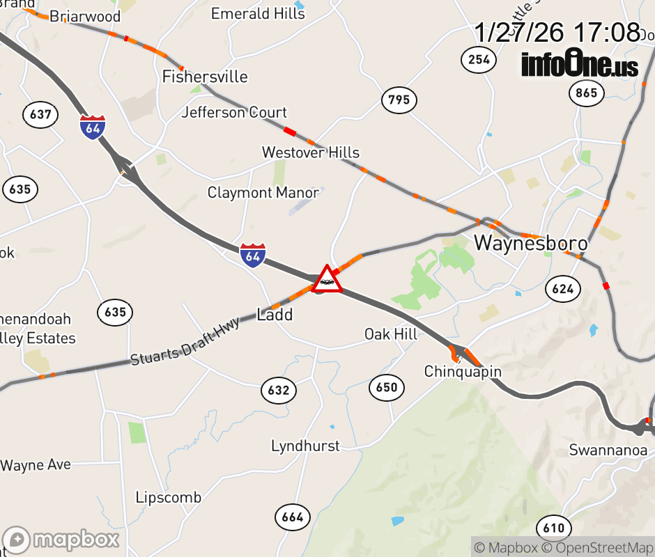 On US-340 in the City of Waynesboro, in the vicinity of the ramp from and to I-64W, motorists can expect delays due to a multi-vehicle crash. The north left shoulder and left lane are closed. Updated: Tue 1/27/26 5:08 PM EST ![]() Updated: Tue 1/27/26 5:08 PM EST |