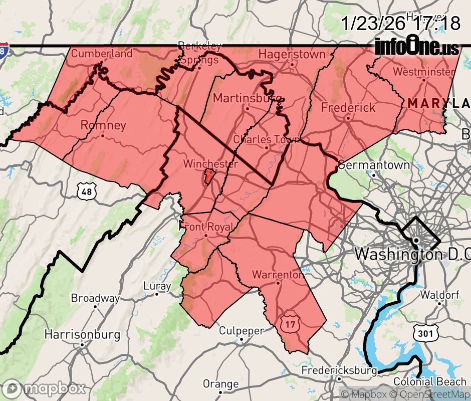 Canceled 1/24/26 5:27 AM Winter Storm Warning issued January 23 at 5:16PM EST until January 26 at 4:00AM EST by NWS Baltimore MD/Washington DC ...MAJOR WINTER STORM WILL IMPACT THE REGION SATURDAY EVENING THROUGH SUNDAY EVENING... .A large area of precipitation will overrun Arctic air in place over the Mid-Atlantic. This will lead to widespread significant snow beginning Saturday evening, with the potential for ice Sunday especially south of Highway 50 and near and east of Interstate 95. In addition to the high threat for significant snow and ice, very cold temperatures are expected tonight through the middle of next week with sub-zero wind chills likely at times. * WHAT... Heavy mixed precipitation expected. Total snow and sleet accumulations between 10 and 16 inches, with highest amounts north and west of US-340. Ice accumulations up to two tenths of an inch, mainly south and east of US-340. * WHERE... Portions of north central and western Maryland, northern and northwest Virginia, and eastern and panhandle West Virginia. * WHEN... From 11 PM Saturday to 4 AM EST Monday. * IMPACTS... Travel could be very difficult to impossible. * ADDITIONAL DETAILS... Snow will likely overspread the area Saturday night, becoming heavy at times with rates of one to two inches per hour possible at times. A mix with sleet or freezing rain is expected Sunday. Visibility of one-quarter mile or less is possible at times. A prolonged period of very cold wind chills is likely beginning this evening and lasting through the middle of next week. ![]() |