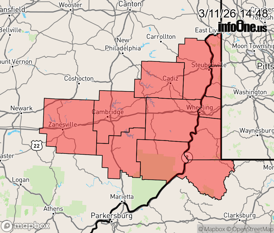 Canceled 3/11/26 4:48 PM Tornado Watch issued March 11 at 2:47PM EDT until March 11 at 5:00PM EDT by NWS Pittsburgh PA TORNADO WATCH 42 REMAINS VALID UNTIL 5 PM EDT THIS AFTERNOON FOR THE FOLLOWING AREAS IN OHIO THIS WATCH INCLUDES 7 COUNTIES IN EAST CENTRAL OHIO BELMONT GUERNSEY HARRISON JEFFERSON OH MONROE MUSKINGUM NOBLE IN WEST VIRGINIA THIS WATCH INCLUDES 5 COUNTIES IN NORTHERN WEST VIRGINIA WETZEL IN THE NORTHERN PANHANDLE OF WEST VIRGINIA BROOKE HANCOCK MARSHALL OHIO THIS INCLUDES THE CITIES OF CADIZ, CALDWELL, CAMBRIDGE, FOLLANSBEE, MARTINS FERRY, MOUNDSVILLE, NEW MARTINSVILLE, ST. CLAIRSVILLE, STEUBENVILLE, WEIRTON, WELLSBURG, WHEELING, WOODSFIELD, AND ZANESVILLE. ![]() |
