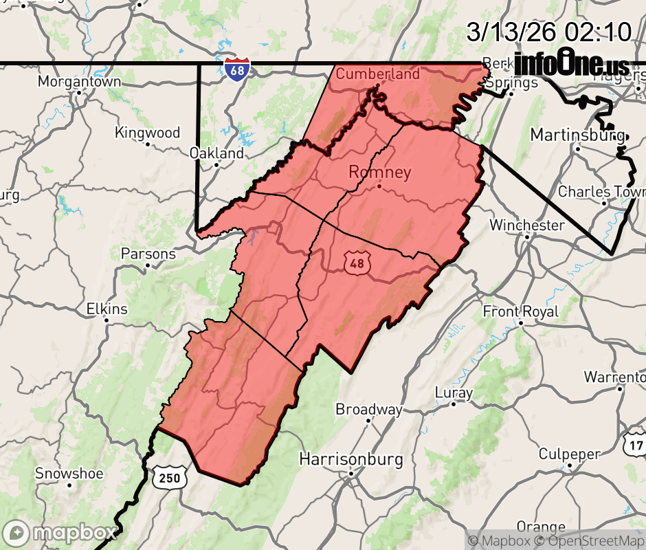 Canceled 3/13/26 10:12 AM Wind Advisory issued March 13 at 2:08AM EDT until March 13 at 8:00PM EDT by NWS Baltimore MD/Washington DC * WHAT... Southwest winds 20 to 30 mph with gusts up to 50 mph expected. * WHERE... In Maryland, Central and Eastern Allegany County. In West Virginia, Eastern Grant, Eastern Mineral, Eastern Pendleton, Hampshire, and Hardy Counties. * WHEN... From 11 AM this morning to 8 PM EDT this evening. * IMPACTS... Gusty winds will blow around unsecured objects. Tree limbs could be blown down and a few power outages may result. ![]() |