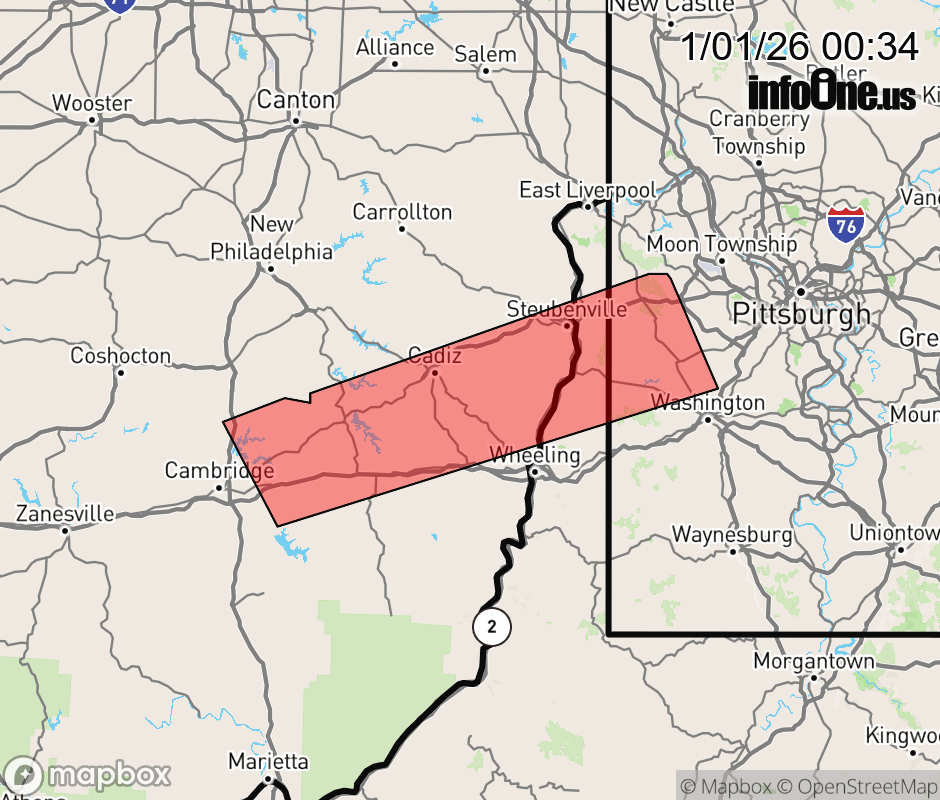 Canceled 1/1/26 12:49 AM Snow Squall Warning issued January 1 at 12:33AM EST until January 1 at 1:15AM EST by NWS Pittsburgh PA The National Weather Service in Pittsburgh has issued a * Snow Squall Warning for... Northern Belmont County in east central Ohio... Northeastern Guernsey County in east central Ohio... Southern Harrison County in east central Ohio... Southern Jefferson OH County in east central Ohio... Northwestern Washington County in southwestern Pennsylvania... Brooke County in northern West Virginia... Hancock County in northern West Virginia... Ohio County in northern West Virginia... * Until 115 AM EST. * At 1233 AM EST, a dangerous snow squall was located along a line from 7 miles west of Imperial to 8 miles southeast of Newcomerstown, or along a line from 9 miles southwest of Moon Township to 10 miles north of Cambridge, moving south at 20 mph. HAZARD...Intense bursts of heavy snow and gusty winds leading to blowing snow and rapidly falling visibility. Wind gusts up to 30 mph. SOURCE...Radar indicated. IMPACT...Travel will become difficult and potentially dangerous within minutes. * Locations impacted include... Weirton, Steubenville, Martins Ferry, St. Clairsville, Cadiz, Wellsburg, West Liberty, Avella, Clearview, Freeport, Wintersville, Mingo Junction, Follansbee, McGovern, Hooverson Heights, Tiltonsville, Burgettstown, Antrim, Yorkville and Bethany. This includes the following highways... Interstate 77 in Ohio between mile markers 54 and 57. Interstate 70 in Ohio between mile markers 185 and 215. ![]() |
