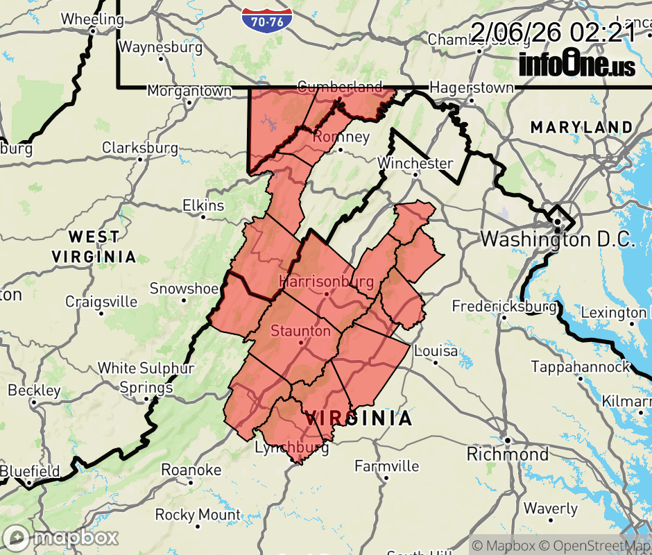 Canceled 2/6/26 9:31 AM High Wind Warning issued February 6 at 2:19AM EST until February 7 at 10:00PM EST by NWS Baltimore MD/Washington DC * WHAT... For the High Wind Warning, northwest winds 25 to 35 mph with gusts up to 60 mph expected. For the Extreme Cold Warning, dangerously cold wind chills of 20 to 30 below zero expected. * WHERE... In Maryland, Eastern Garrett and Extreme Western Allegany Counties. In Virginia, Central Virginia Blue Ridge and Northern Virginia Blue Ridge, and Western Highland County. In West Virginia, Western Grant, Western Mineral, and Western Pendleton Counties. * WHEN... For the High Wind Warning, from midnight tonight to 10 PM EST Saturday. For the Extreme Cold Warning, from 4 AM Saturday to 10 AM EST Sunday. * IMPACTS... Damaging winds will blow down trees and power lines. Widespread power outages are expected. Travel will be difficult, especially for high profile vehicles. The dangerously cold wind chills could cause hypothermia and frostbite on exposed skin in as little as 30 minutes. ![]() |