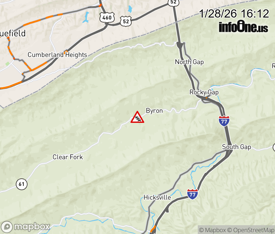 On VA-61 in the County of Bland, in the vicinity of Basswood Ln; N Scenic Hwy; Wilderness Rd; US-52N/S; VA-61W, US-52S, motorists can expect delays due to an incident. All east lanes are closed. All west lanes are closed. ![]() |