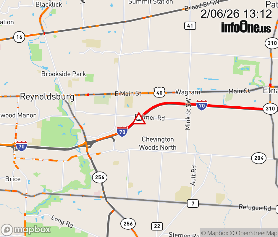 The left lane is blocked on I-70 West beyond SR-310/Etna/Pataskala, due to a crash. Updated: Fri 2/6/26 1:12 PM EST ![]() Updated: Fri 2/6/26 1:12 PM EST |