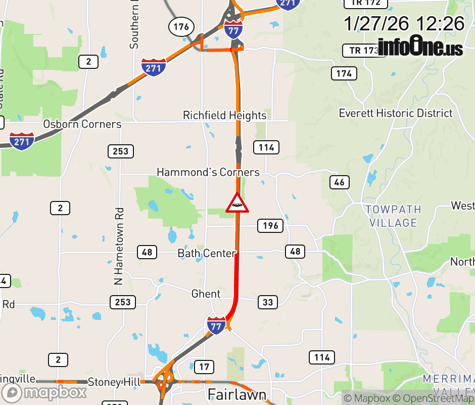 The left lane is blocked on I-77 South beyond Summit County Rest Area 4-32, due to a crash. Updated: Tue 1/27/26 12:26 PM EST ![]() Updated: Tue 1/27/26 12:26 PM EST |