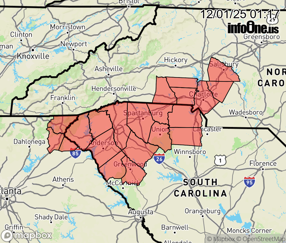 Canceled 12/1/25 7:00 AM Special Weather Statement issued December 1 at 1:16AM EST by NWS Greenville-Spartanburg SC Areas of patchy dense fog have developed across most of the South Carolina Upstate and some parts of the North Carolina Piedmont along Interstate 85. Visibility below 1 mile, and as low as 1/4 mile, is reported at multiple observing sites across these areas. Expect fog to continue for the next several hours, possibly until rush hour. Visibility may drop suddenly and over short distances. If driving, increase your following distance and turn on your low-beam headlights. ![]() |