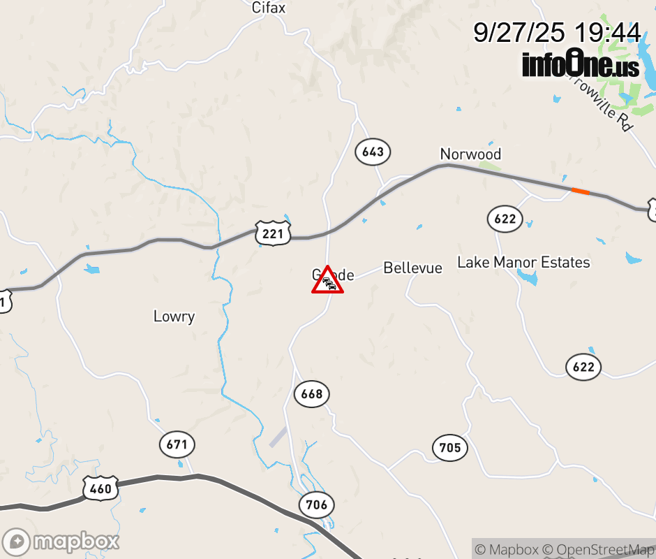 On Rt. 762 in the County of Bedford, in the vicinity of Goode Rd; Rt. 668N/S (Bedford County), motorists can expect delays due to weather. All east lanes are closed. All west lanes are closed. ![]() |