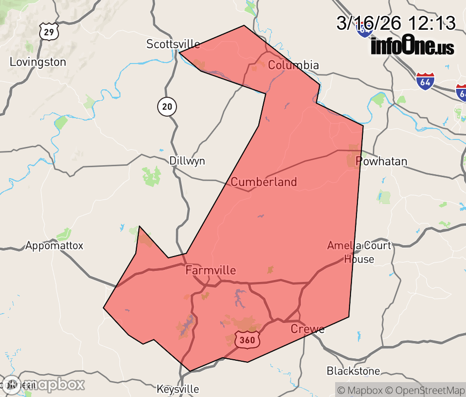 Canceled 3/16/26 12:33 PM Severe Thunderstorm Warning issued March 16 at 12:12PM EDT until March 16 at 1:00PM EDT by NWS Wakefield VA SVRAKQ The National Weather Service in Wakefield has issued a * Severe Thunderstorm Warning for... Cumberland County in central Virginia... Prince Edward County in central Virginia... Northwestern Nottoway County in south central Virginia... Western Amelia County in central Virginia... Western Powhatan County in central Virginia... Southwestern Fluvanna County in central Virginia... * Until 100 PM EDT. * At 1211 PM EDT, severe thunderstorms were located along a line extending from near Tower Hill to near Aspen, moving northeast at 55 mph. HAZARD...60 mph wind gusts. SOURCE...Radar indicated. IMPACT...Expect damage to trees and powerlines. * Severe thunderstorms will be near... Prospect and Darlington Heights around 1220 PM EDT. Hampden Sydney around 1225 PM EDT. Farmville and Hampden Sydney College around 1230 PM EDT. Longwood University and Guinea Mills around 1235 PM EDT. Fork Union and Rice around 1240 PM EDT. Cumberland, Columbia, and Lakeside Village around 1245 PM EDT. Cartersville, Duncan, and Sunnyside around 1250 PM EDT. Tobaccoville around 1255 PM EDT. Other locations impacted by these severe thunderstorms include Raines Tavern, Tuggle, Prince Edward Station, Angola, Briery, Oak Forest, Twin Lakes State Park, Shores, Central Plains, and Bremo Bluff. ![]() |