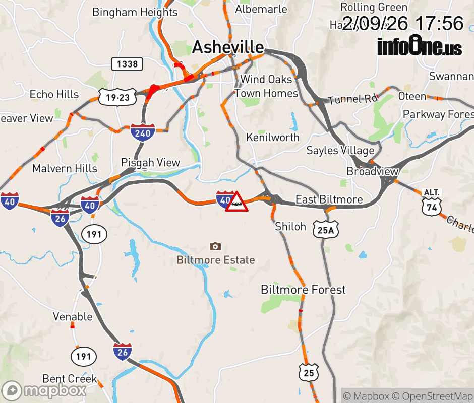 The right shoulder is closed .5 miles past Exit 50B, US 25, (Hendersonville Road). Updated: Mon 2/9/26 5:56 PM EST ![]() Updated: Mon 2/9/26 5:56 PM EST |
