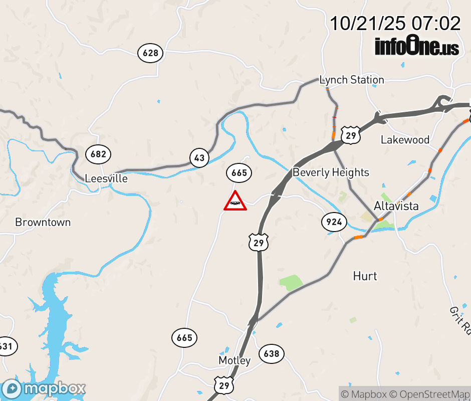 On Rt. 924 East in the County of Pittsylvania, in the vicinity of Rockford School Rd; Rt. 665E/W (Pittsylvania County), motorists can expect delays due to a vehicle crash. Lane closures exist. ![]() |