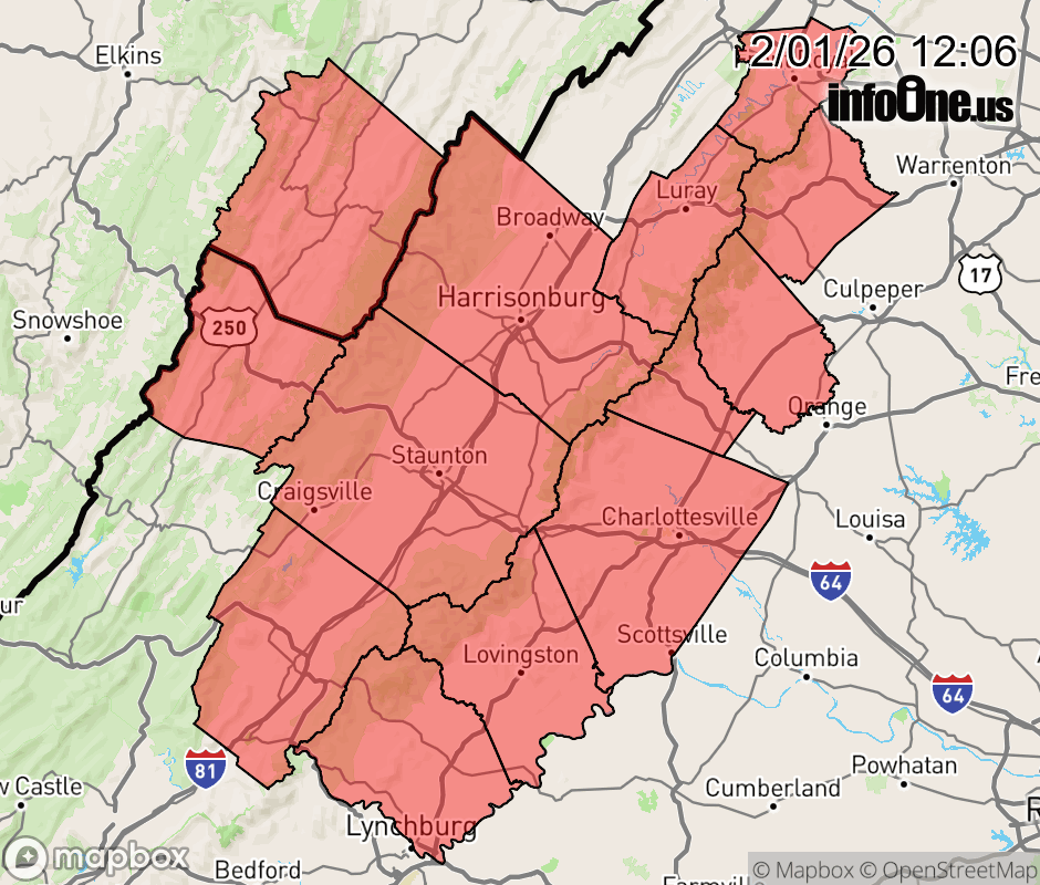 Canceled 2/1/26 7:56 PM Cold Weather Advisory issued February 1 at 12:05PM EST until February 2 at 10:00AM EST by NWS Baltimore MD/Washington DC * WHAT... Very cold wind chills as low as 15 below expected. * WHERE... In Virginia, Central Virginia Blue Ridge and Northern Virginia Blue Ridge, and Eastern Highland County. In West Virginia, Eastern Pendleton County. * WHEN... From 6 PM this evening to 10 AM EST Monday. * IMPACTS... Frostbite and hypothermia will occur if unprotected skin is exposed to these temperatures. Wind chill values can lead to hypothermia with prolonged exposure. ![]() |