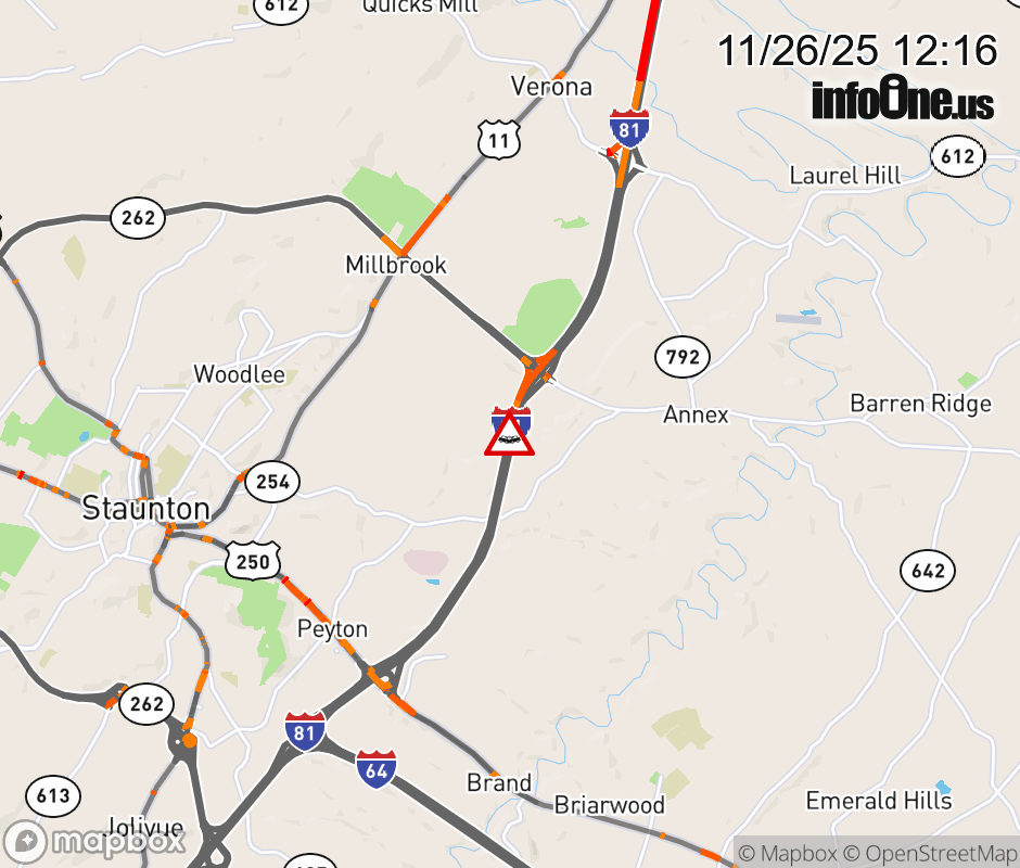 On I-81 South at mile marker 225 in the County of Augusta, motorists can expect delays due to a multi-vehicle crash. Traffic backups are approximately 3.5 miles. Updated: Wed 11/26/25 12:16 PM EST ![]() Updated: Wed 11/26/25 12:16 PM EST |