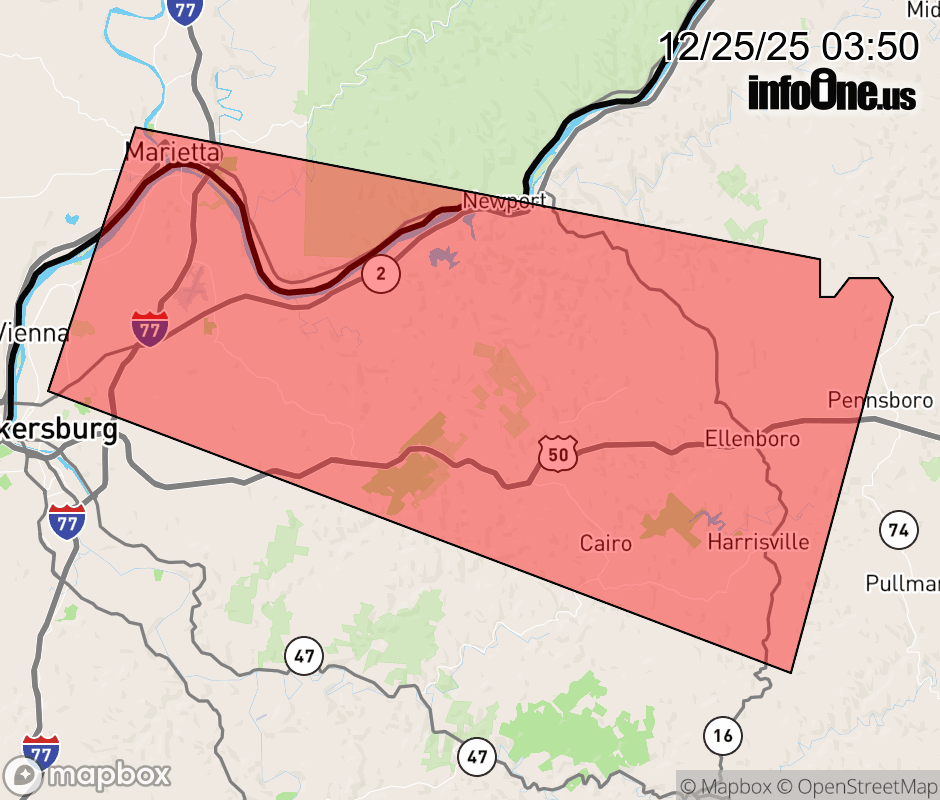 Canceled 12/25/25 4:15 AM Special Weather Statement issued December 25 at 3:48AM EST by NWS Charleston WV At 348 AM EST, Doppler radar was tracking a strong thunderstorm near Boaz, or near Marietta, moving east at 60 mph. HAZARD...Nickel size hail. SOURCE...Radar indicated. IMPACT...Minor hail damage to vegetation is possible. Locations impacted include... Parkersburg, Marietta, Harrisville, St. Marys, Vienna, Williamstown, Pennsboro, Belmont, North Bend State Park, Boaz, North Hills, Ellenboro, Cairo, Willow Island, Nutter Farm, Maxwell, Schultz, Waverly, Hebron, and Pike. This includes the following highways... Interstate 77 in West Virginia between mile markers 178 and 186. Interstate 77 in Ohio near mile marker 1. Route 50 in West Virginia between mile markers 18 and 41. ![]() |
