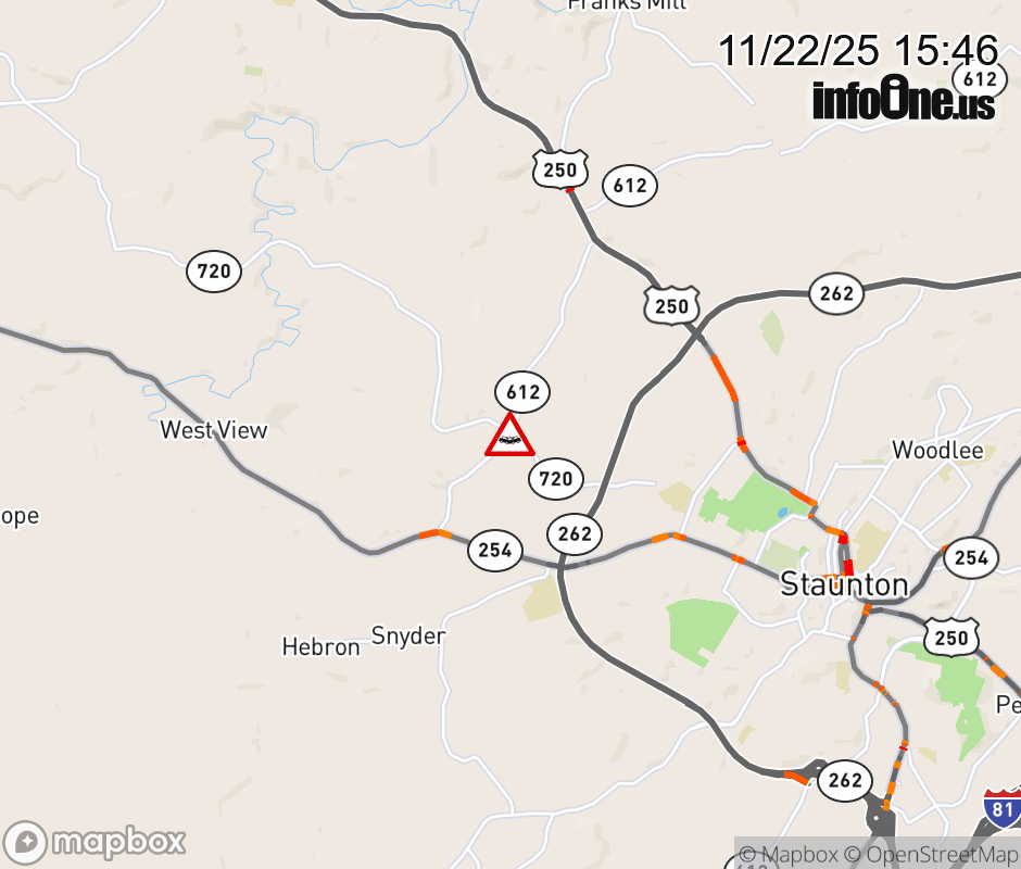 On Rt. 720 in the County of Augusta, in the vicinity of Frog Pond Rd; Rt. 612E/W (Augusta County), motorists can expect delays due to a vehicle crash. All east lanes are closed. All west lanes are closed. ![]() |