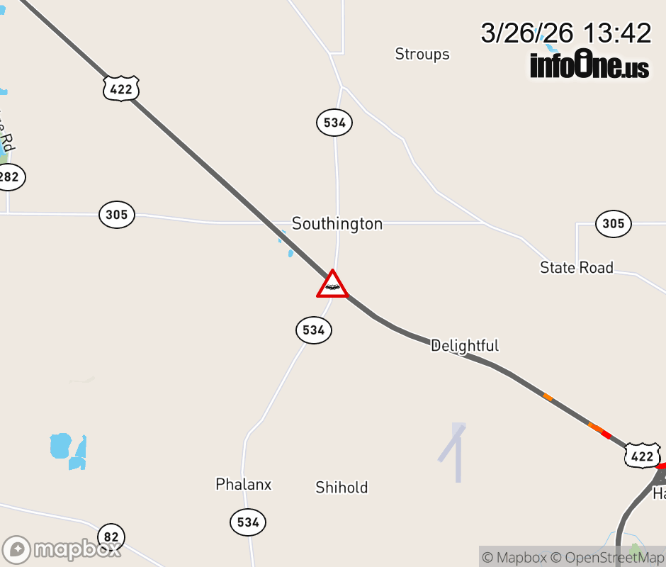 US-422 CLOSED in BOTH DIRECTIONS from SR-5/SR-82 to SR-534 (MM: 8.2), due to involving a semi-trailer crash. Use alternate route. ![]() |