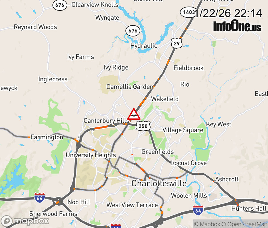 On US-29 South in the County of Albemarle, in the vicinity of Hydraulic Rd; Rt. 743N/S (Albemarle County), motorists can expect delays due to a vehicle crash. Updated: Thu 1/22/26 10:14 PM EST ![]() Updated: Thu 1/22/26 10:14 PM EST |