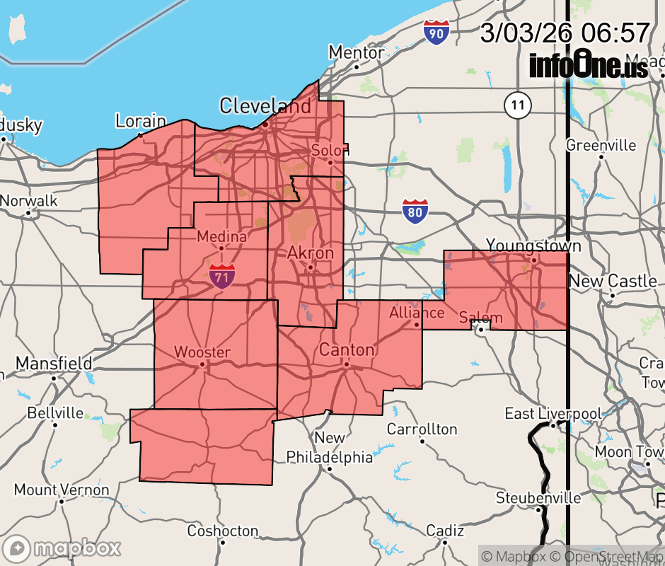 Canceled 3/3/26 8:30 AM Special Weather Statement issued March 3 at 6:56AM EST by NWS Cleveland OH Patchy light freezing rain is possible this morning with temperatures near the freezing mark. Precipitation is expected to be light, but a few slick spots may develop. Use caution, especially on bridges and overpasses that will be most prone to icing. Temperatures are expected to warm this morning, ending the threat of slick conditions. ![]() |