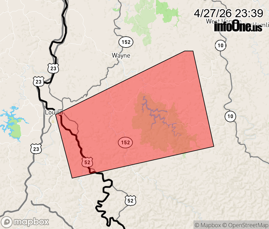 Canceled 4/28/26 12:00 AM Special Weather Statement issued April 27 at 11:38PM EDT by NWS Charleston WV At 1137 PM EDT, Doppler radar was tracking a strong thunderstorm near Dunlow, or near Louisa, moving east at 45 mph. HAZARD...Wind gusts up to 40 mph and pea size hail. SOURCE...Radar indicated. IMPACT...Gusty winds could knock down tree limbs and blow around unsecured objects. Minor hail damage to vegetation is possible. Locations impacted include... Louisa, Fort Gay, Kiahsville, Dunlow, East Lynn Lake, East Lynn, Genoa, Clifford, and Glenhayes. ![]() |