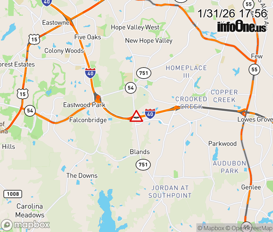 The right shoulder is closed at Exit 274 (NC 751). Updated: Sat 1/31/26 5:56 PM EST ![]() Updated: Sat 1/31/26 5:56 PM EST |
