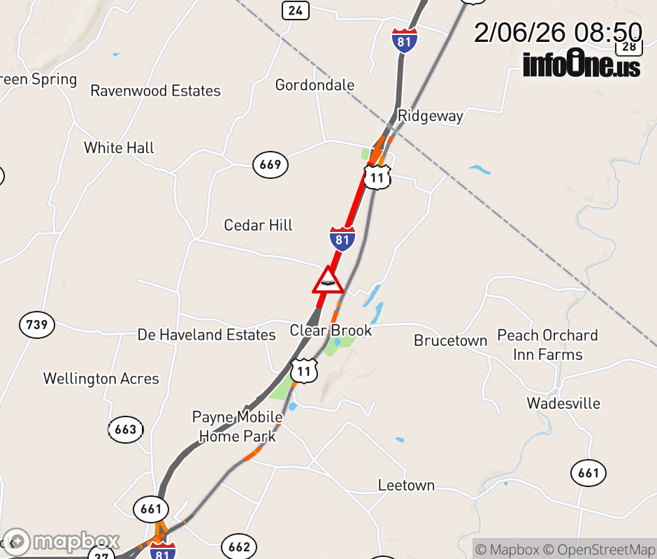 On I-81 South at mile marker 322 in the County of Frederick, motorists can expect delays due to a vehicle crash. Updated: Fri 2/6/26 8:50 AM EST ![]() Updated: Fri 2/6/26 8:50 AM EST |