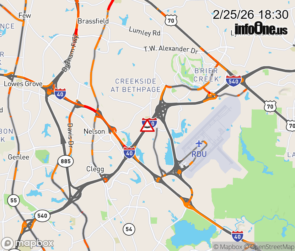 The right shoulder is closed near Exit 1 (Aviation Pkwy). ![]() Updated: Wed 2/25/26 6:30 PM EST |