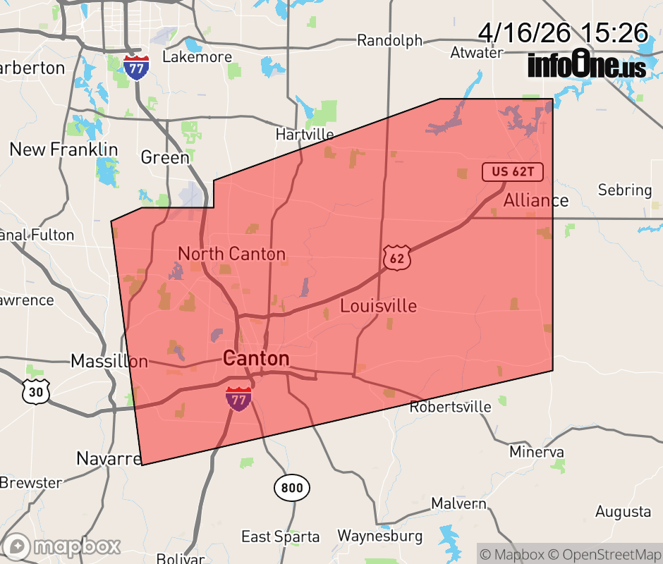 Canceled 4/16/26 3:41 PM Severe Thunderstorm Warning issued April 16 at 3:21PM EDT until April 16 at 4:00PM EDT by NWS Cleveland OH SVRCLE The National Weather Service in Cleveland has issued a * Severe Thunderstorm Warning for... Central Stark County in northeastern Ohio... * Until 400 PM EDT. * At 321 PM EDT, a severe thunderstorm was located over Canton, moving east at 50 mph. HAZARD...60 mph wind gusts and quarter size hail. SOURCE...Radar indicated. IMPACT...Minor damage to vehicles is possible. Expect damage to trees and power lines. * Locations impacted include... Canton, Massillon, Green, Alliance, North Canton, Louisville, Hartville, East Canton, Meyers Lake, Hills And Dales, Limaville, Greentown, Maximo, and Perry Heights. ![]() |
